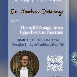 由臺大國際學院舉辦之New Vision Lecture Series 於12/2邀請到 Michel Delseny 進行The mRNA saga, from hypothesis to vaccines講座分享,歡迎有興趣的大眾報名參加。